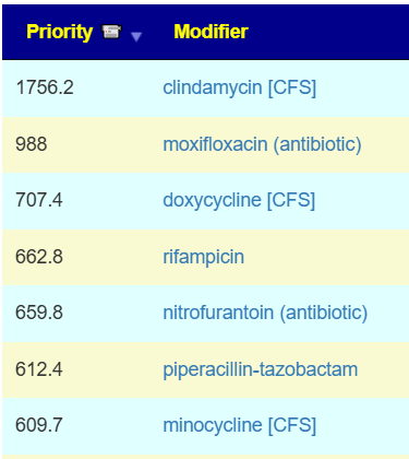 The earlier approach focuses on targeting bacteria that show statistical associations with symptoms. This approach often places many antibiotics near the top of the recommendations. When antibiotics are involved, I tend to favor the Cecile Jadin Protocol for ME/CFS.