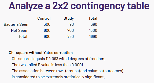 Just looking at the table, it is obvious that this bacteria is less likely to be seen in a study group. We can just drop these numbers in a page like this one, and get the results.