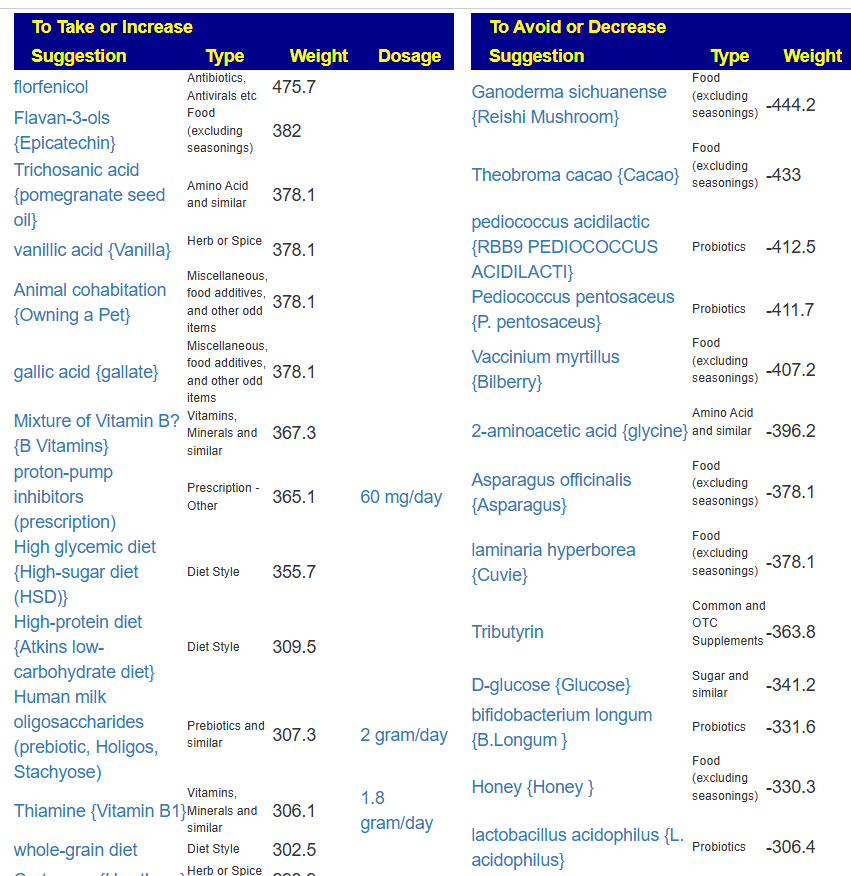 The Avoids. I noticed that Bofutsushosan is an avoid. This is a promoter of Akkermansia — which was on our avoid probiotics list. There appears to be reasonable consistency although we are using two different sources and mechanism to get these suggestions.
